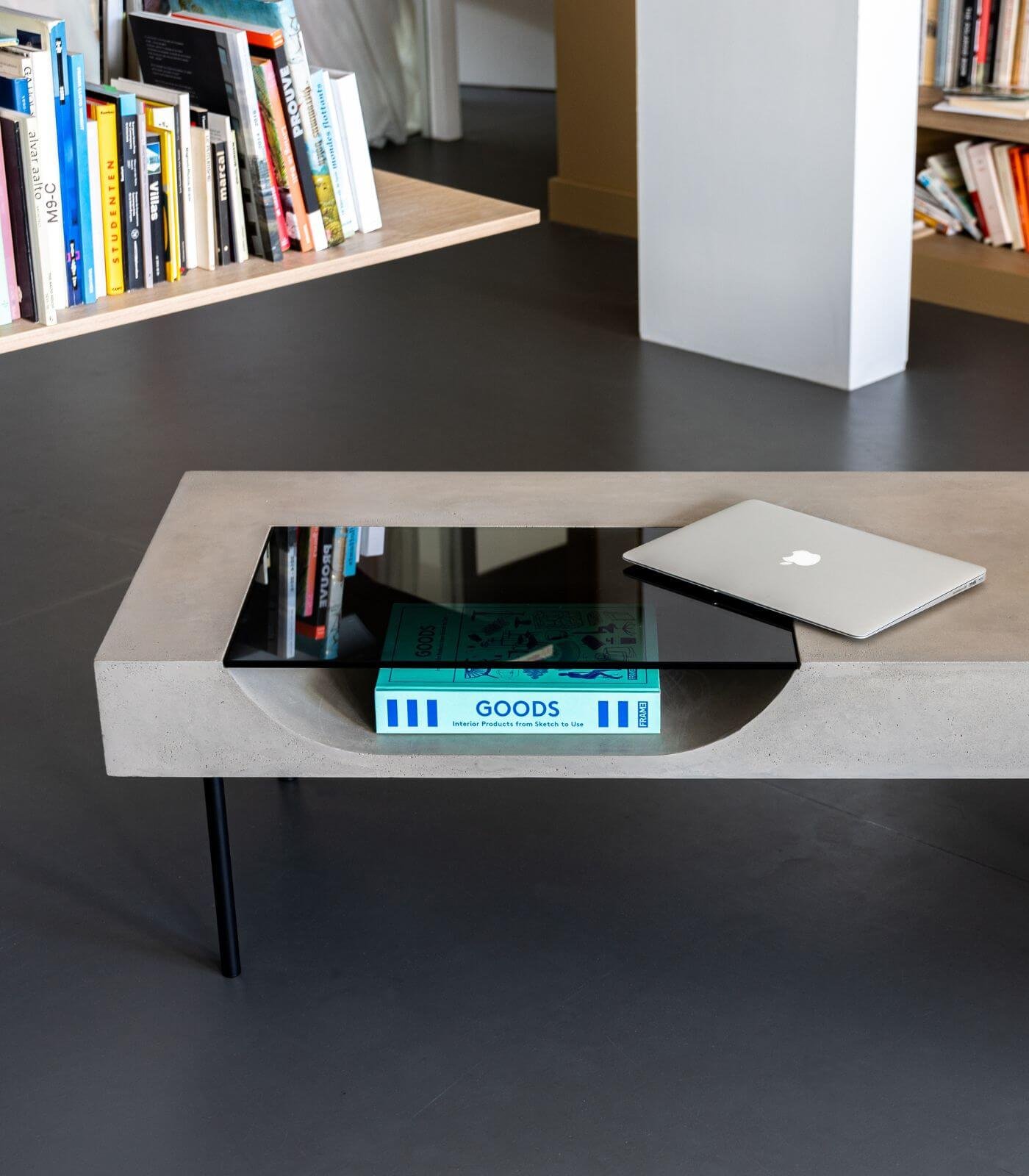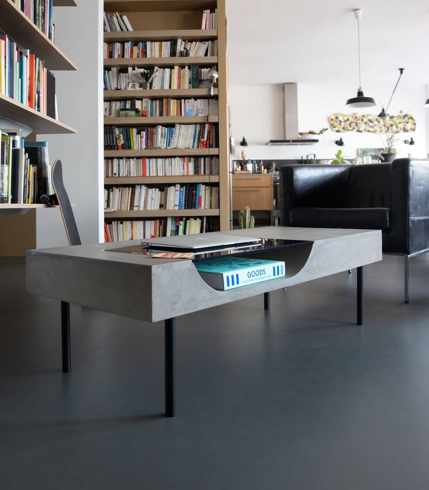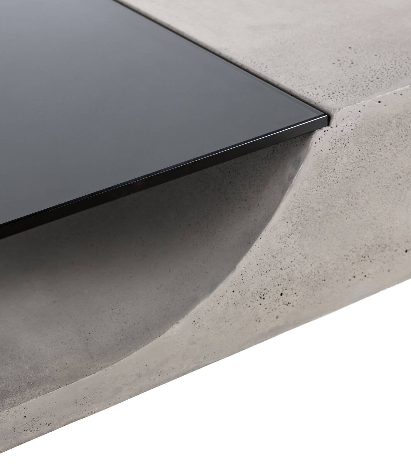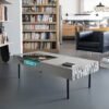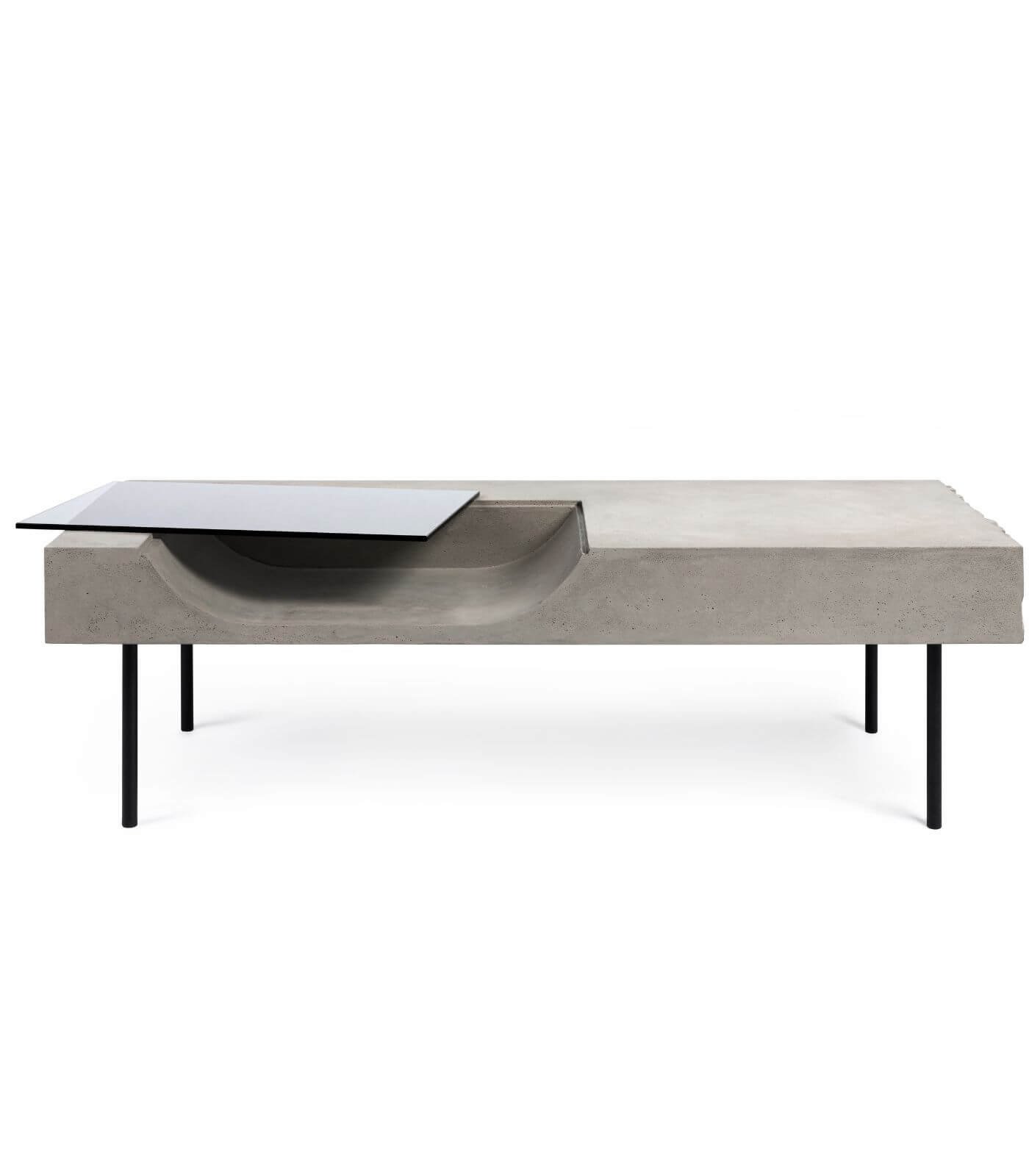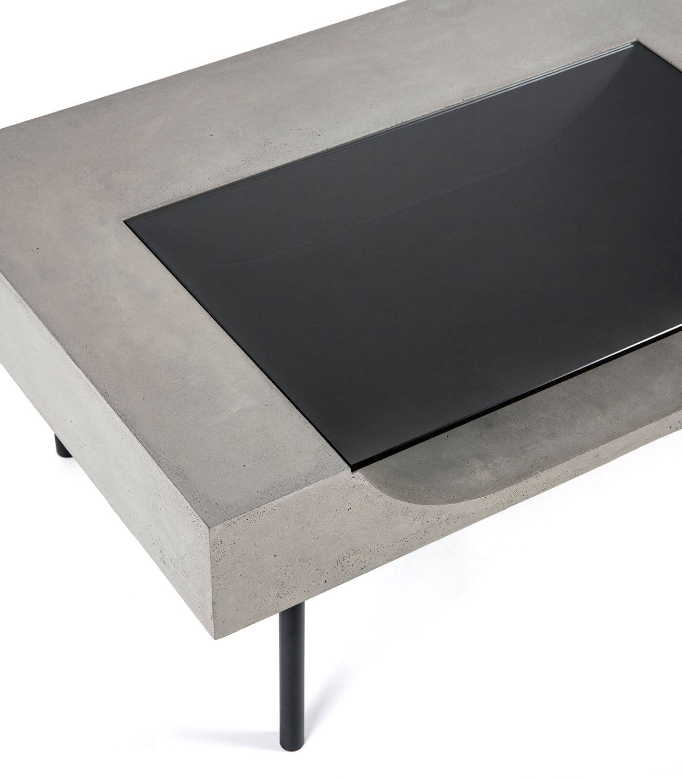 Le plateau en béton de la Table basse Curb semble flotter à 25 cm du sol, soutenu par quatre barres de métal plein qui lui confèrent une stabilité à toute épreuve. Cette conception ingénieuse crée un effet visuel saisissant, donnant l’impression que la table basse est en suspension, ajoutant ainsi une dimension de légèreté à son design robuste.