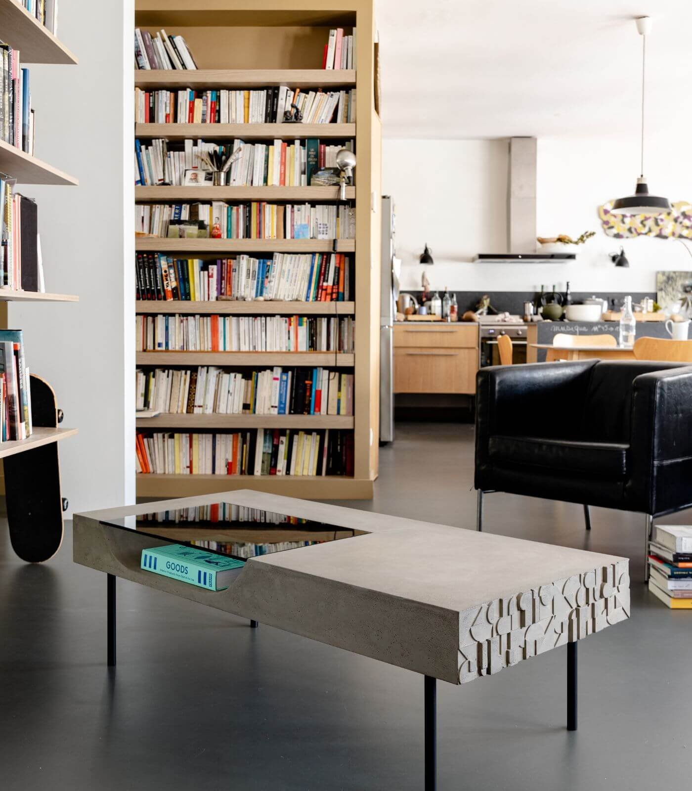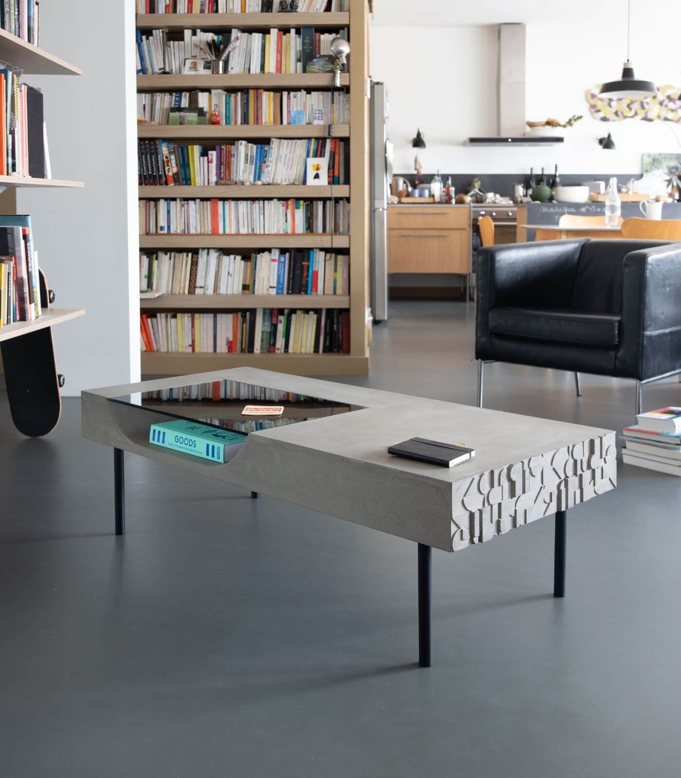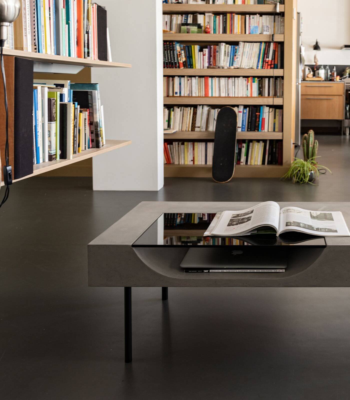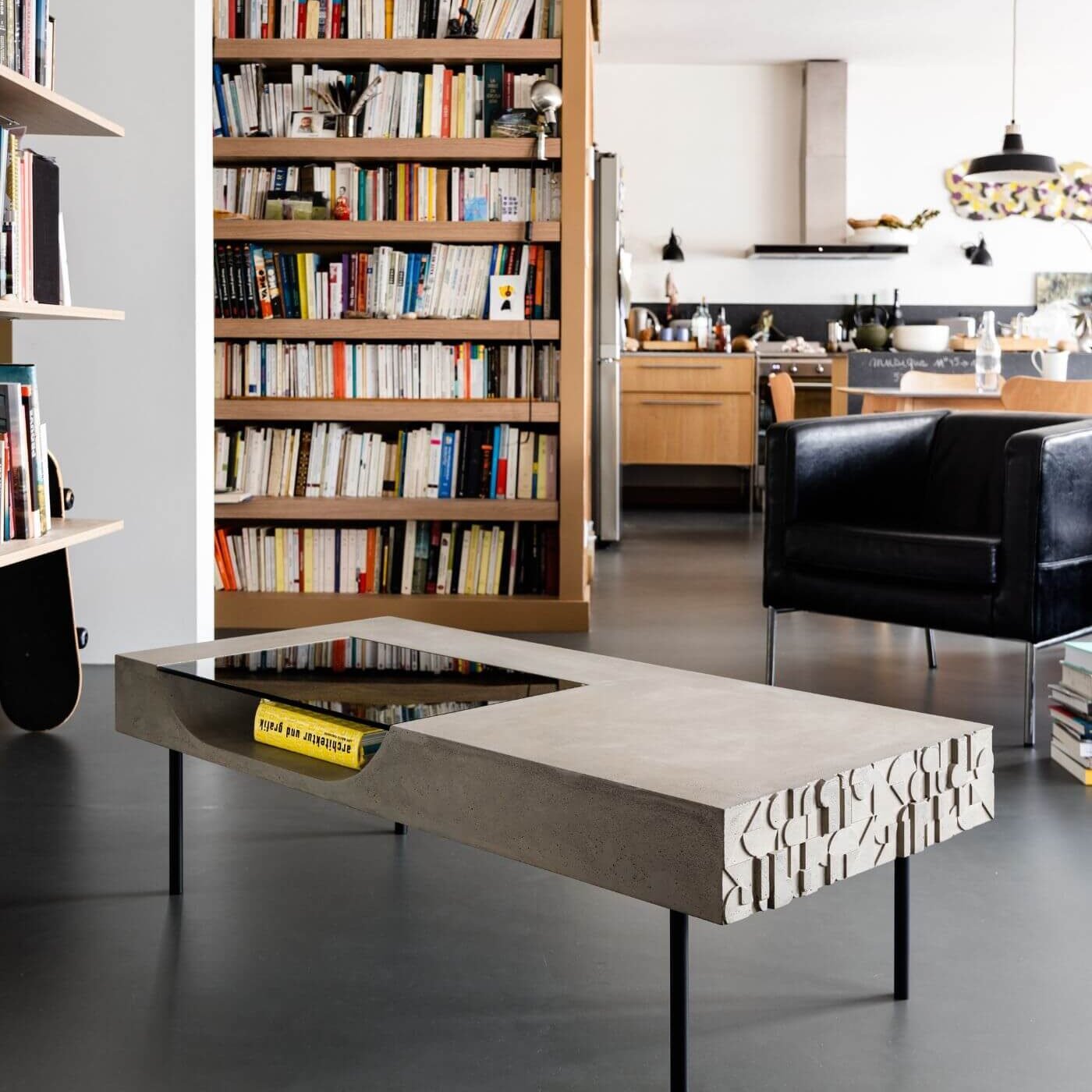 Le plateau en béton de la Table basse Curb semble flotter à 25 cm du sol, soutenu par quatre barres de métal plein qui lui confèrent une stabilité à toute épreuve. Cette conception ingénieuse crée un effet visuel saisissant, donnant l’impression que la table basse est en suspension, ajoutant ainsi une dimension de légèreté à son design robuste.