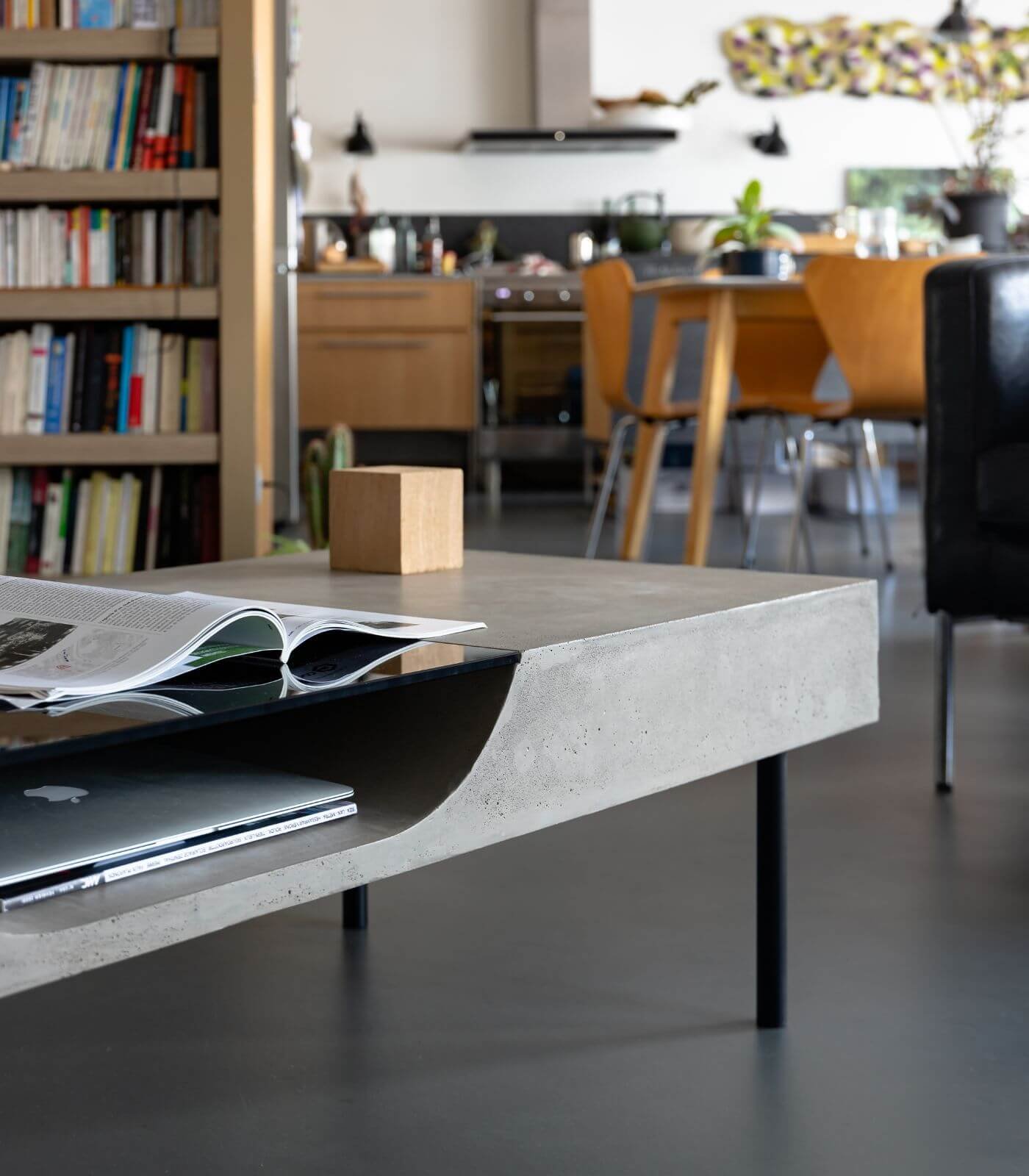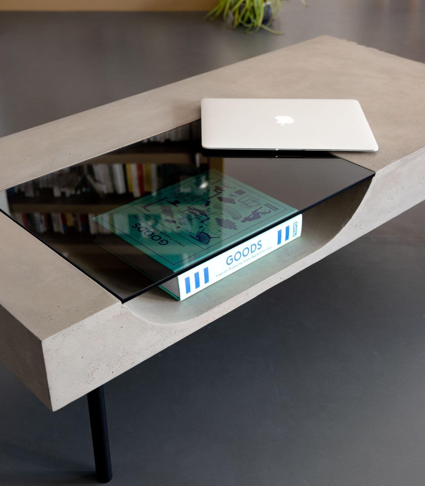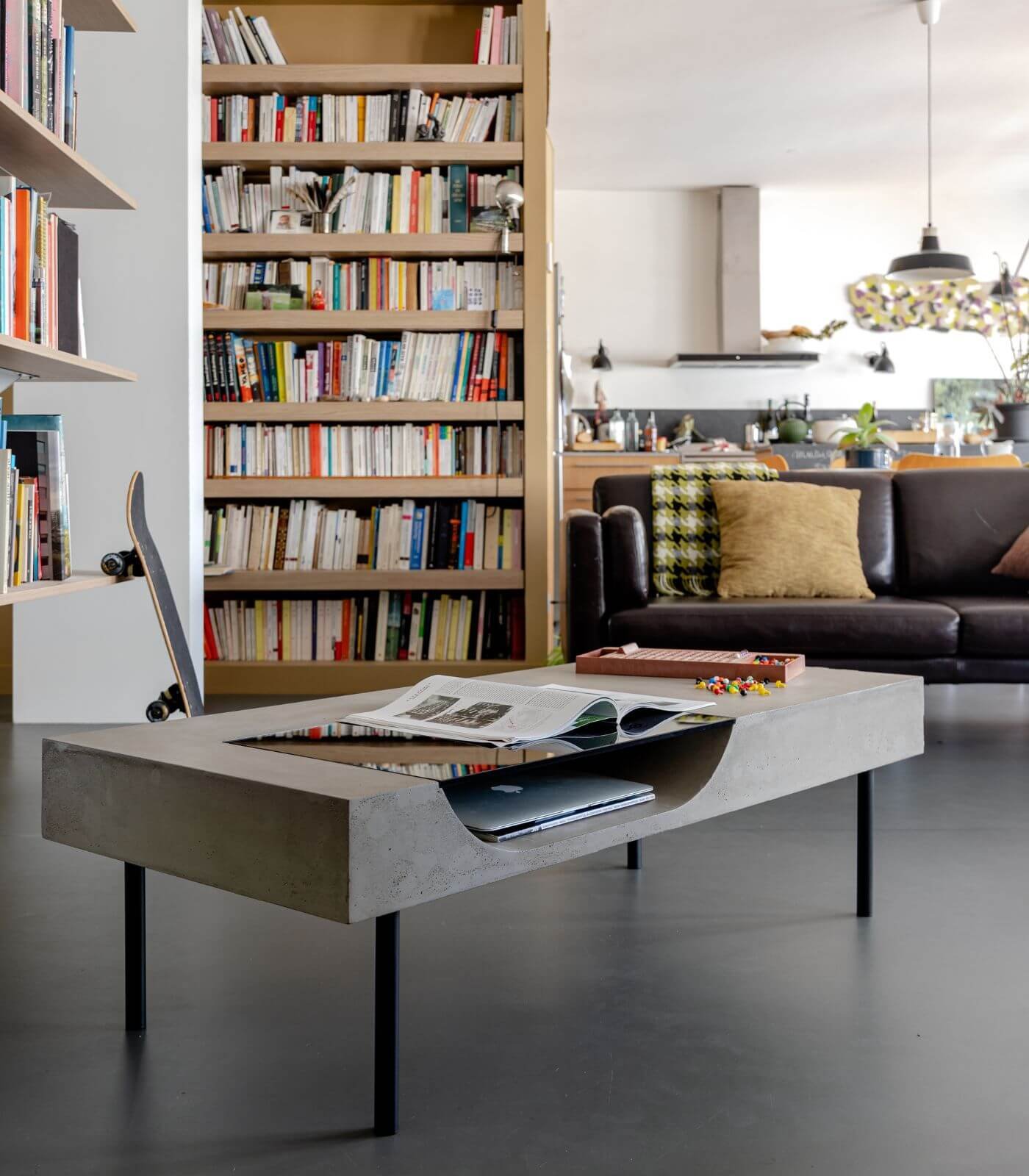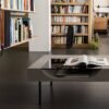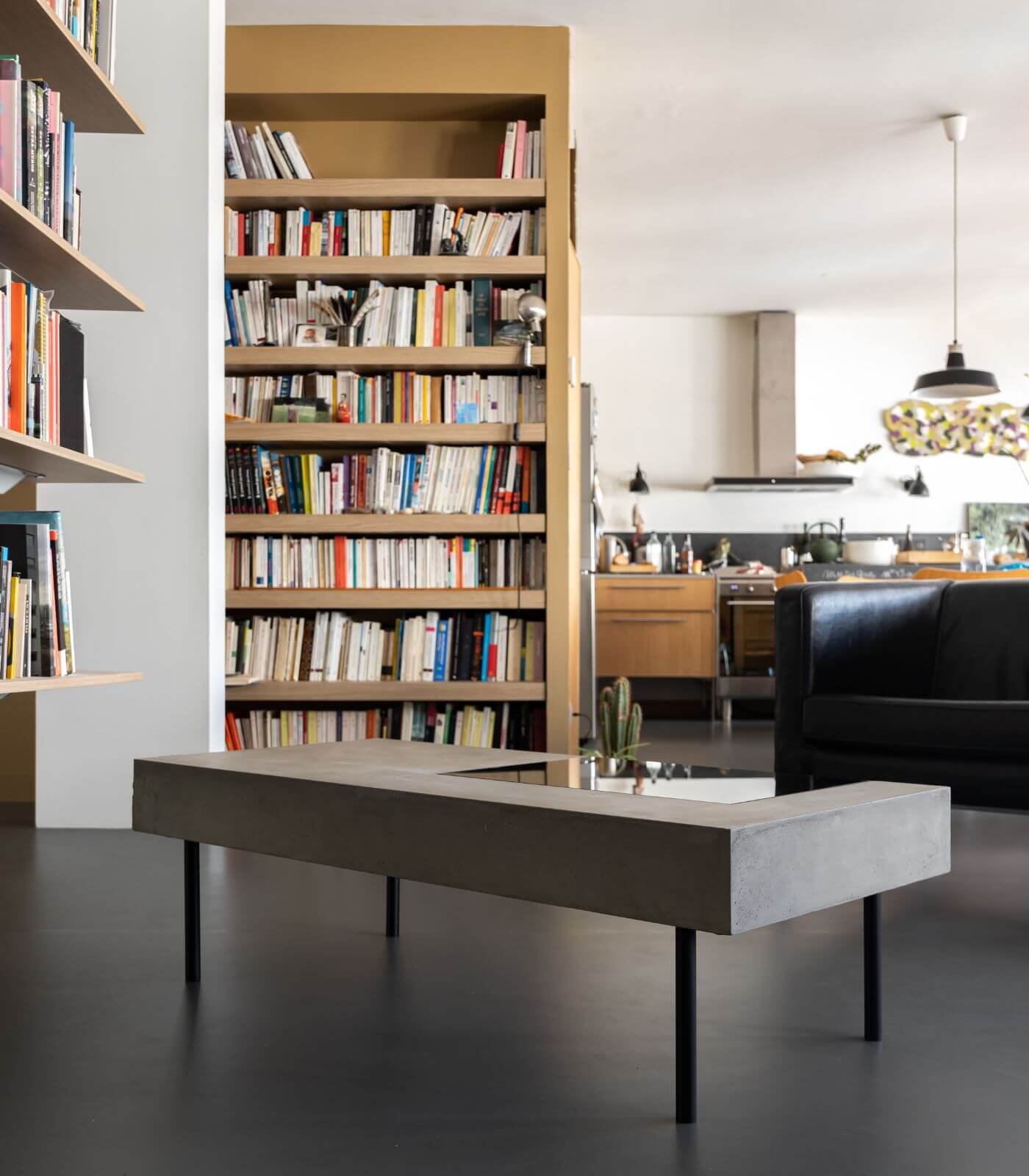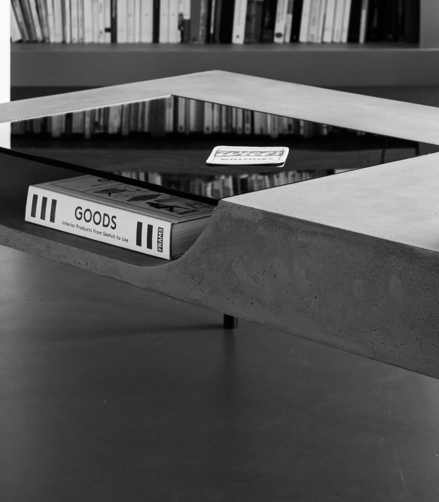 Le plateau en béton de la Table basse Curb semble flotter à 25 cm du sol, soutenu par quatre barres de métal plein qui lui confèrent une stabilité à toute épreuve. Cette conception ingénieuse crée un effet visuel saisissant, donnant l’impression que la table basse est en suspension, ajoutant ainsi une dimension de légèreté à son design robuste.