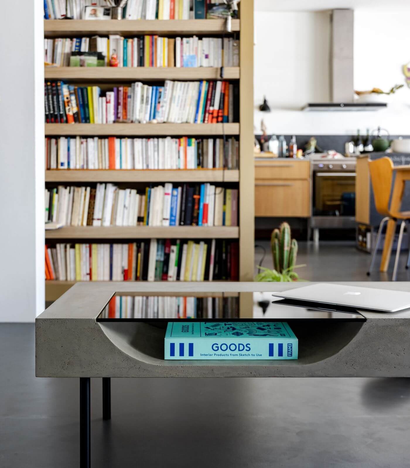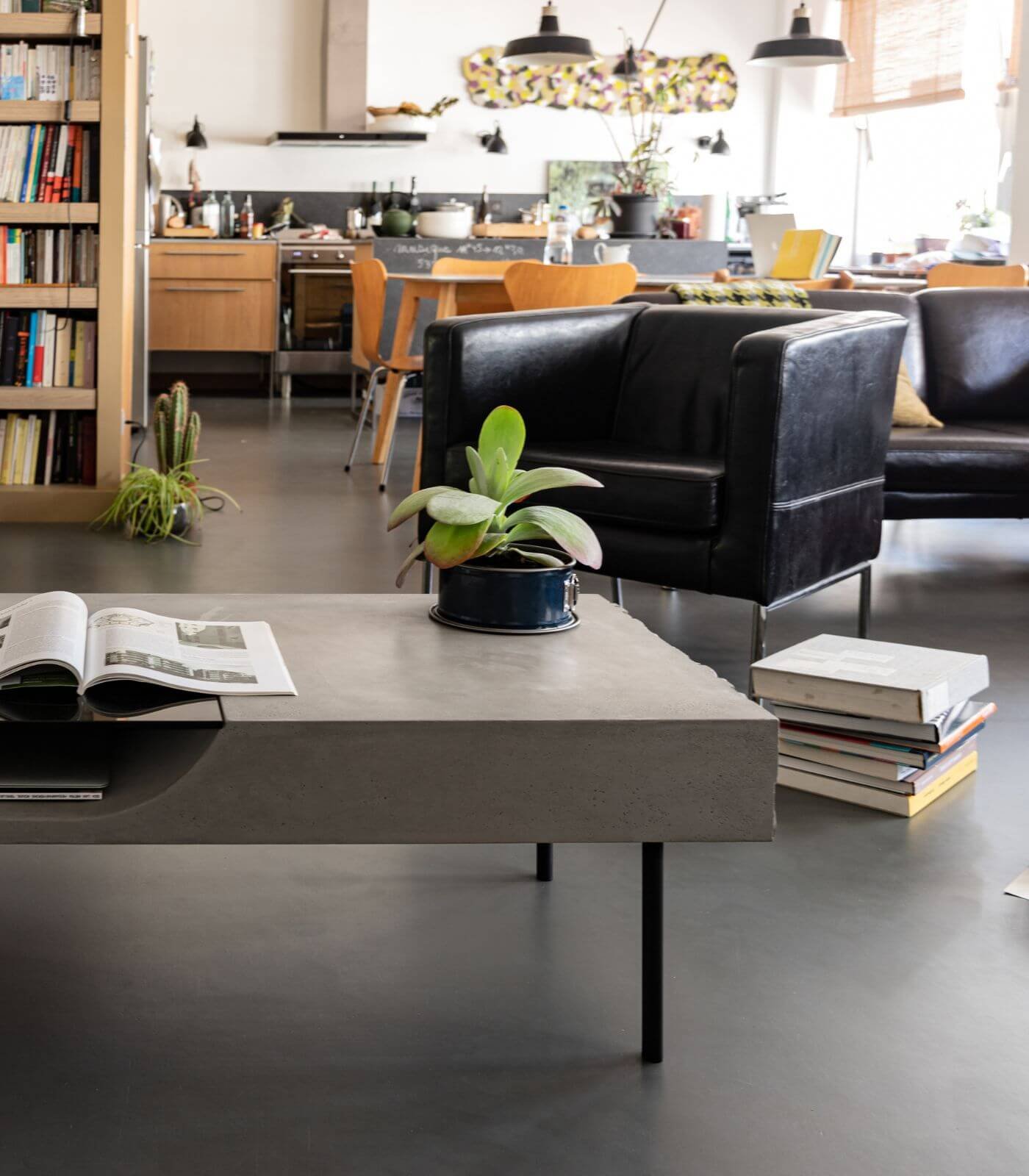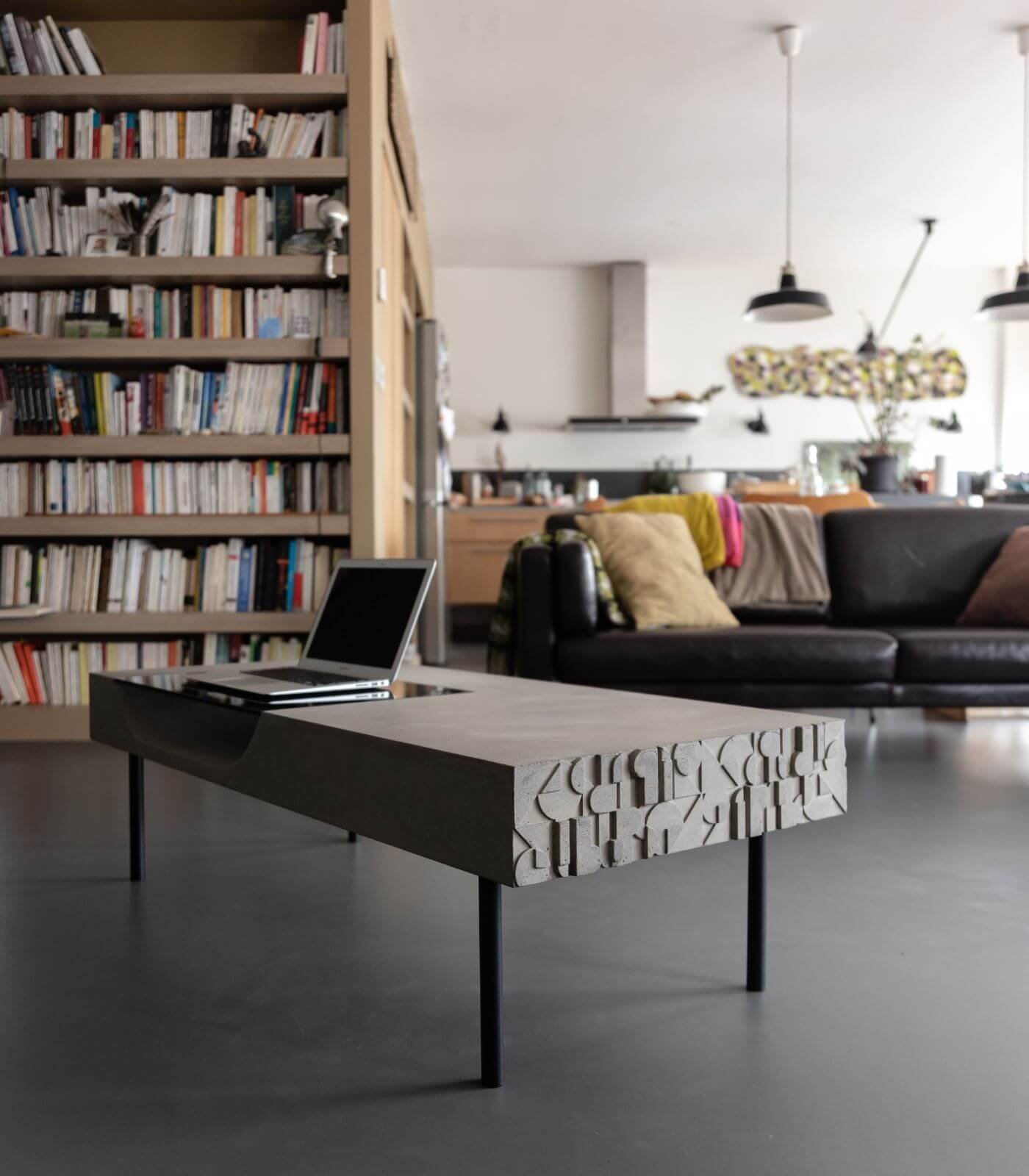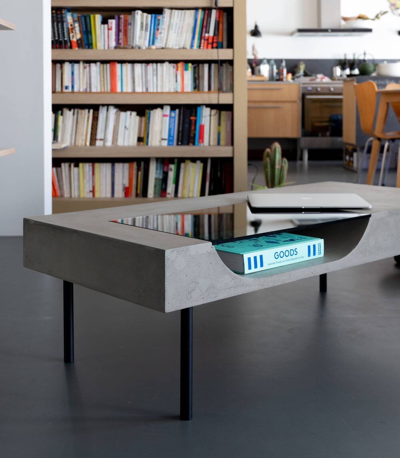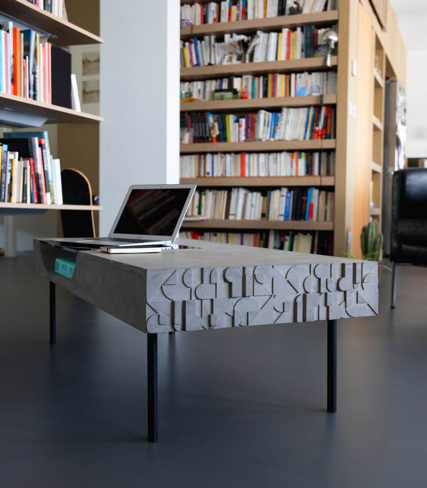 Le plateau en béton de la Table basse Curb semble flotter à 25 cm du sol, soutenu par quatre barres de métal plein qui lui confèrent une stabilité à toute épreuve. Cette conception ingénieuse crée un effet visuel saisissant, donnant l’impression que la table basse est en suspension, ajoutant ainsi une dimension de légèreté à son design robuste.