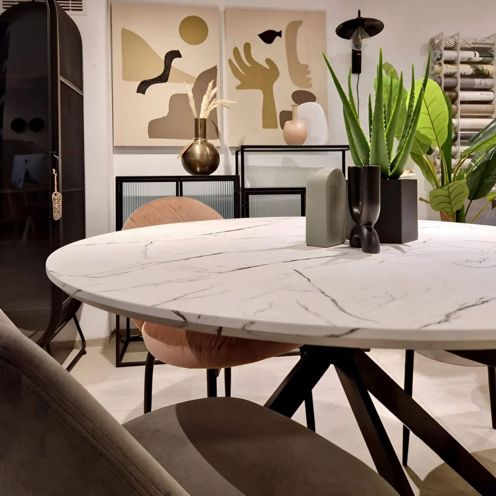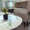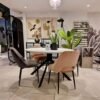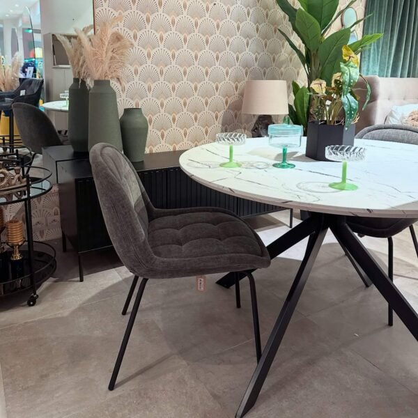 Le plateau de table rond a un diamètre de 120 cm, qui convient pour profiter d’un repas de 4 à 5 personnes. Le plateau a une épaisseur de 25 mm et est laqué dans un élégant aspect marbre blanc.